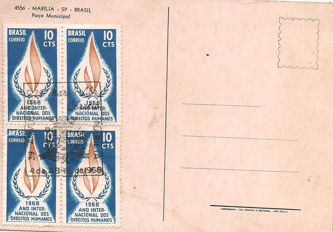 Verso de cartão postal com aplicação de carimbo comemorativo aos 39 anos de Marília.